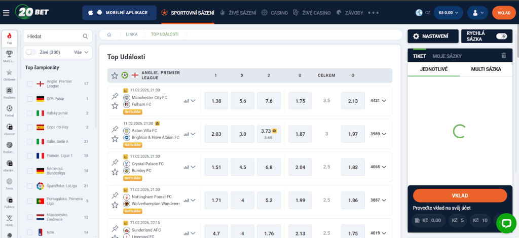 20bet | 100 % až 3 000 CZK + 120 FS | Visa, MC, Skrill, Neteller, krypto | 250 CZK | Curaçao | 5 000+ |