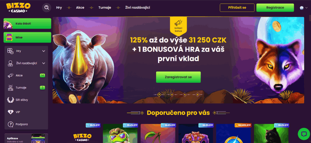 BizzoCasino | 125 % až 31 250 CZK + 125 FS | Visa, MC, krypto, e-peněženky | 500 CZK | Curaçao + Kahnawake | 3 000+ |