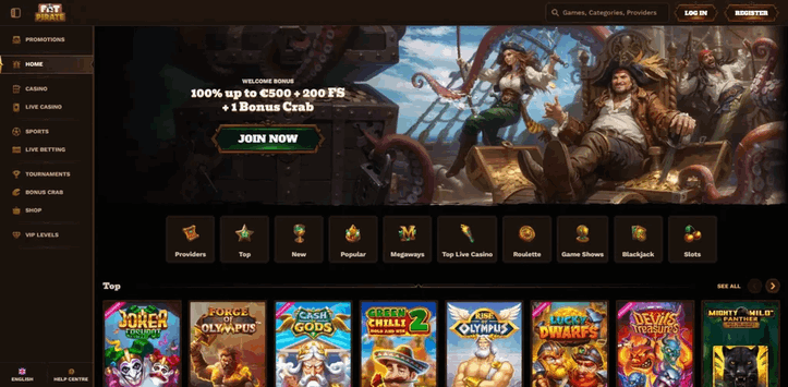 FatPirate má pirátský design, který jde napříč celou platformou — od lobby až po bonusové animace. Herní katalog přesahuje 6 000 titulů od 89 studií včetně NetEnt, Betsoft, Playtech a Belatra. Z konkrétních her jsem testoval Funky Time Live, Crazy Coin Flip a Monopoly Live — live game shows sekce má 42 titulů, což je jeden z největších výběrů v testu. Crash games, keno a scratch karty tvoří samostatné kategorie. Denní Bonus Crab přináší každý den novou příležitost k odměně bez složitých podmínek. Sportovní sekce pokrývá všechny hlavní sporty včetně live sázení.