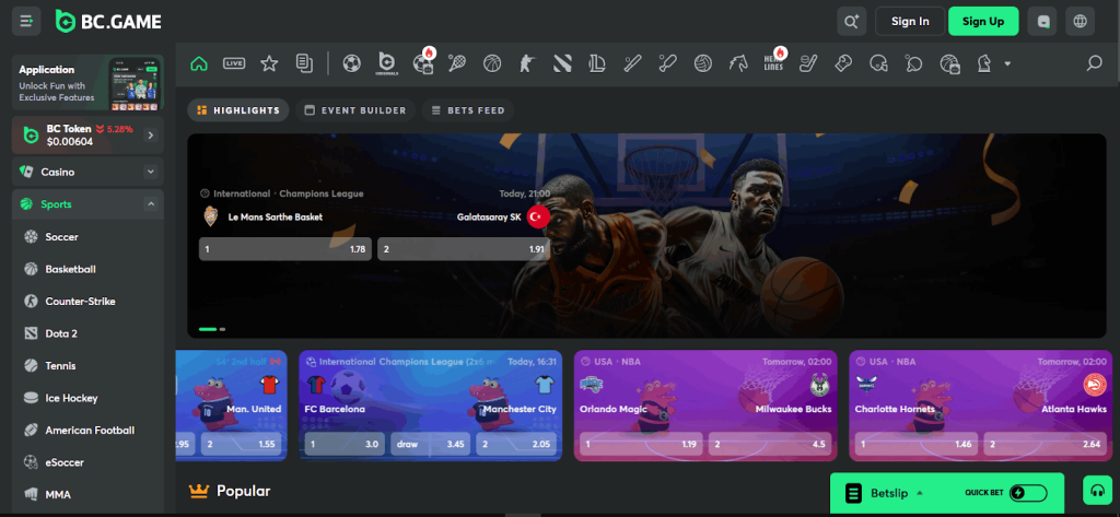 BC.Game má vlastní sekci her — BC Originals — které jinde prostě nenajdete. Jde o in-house tituly vyvinuté přímo platformou, mimo standardní katalog poskytovatelů. Vedle toho běží přes 50 externích studií včetně Pragmatic Play, Hacksaw Gaming, Nolimit City a Evolution Gaming. Live casino pokrývá blackjack, ruletu, baccarat i game shows od Evolution — kvalita streamu bez problémů. Crash Games sekce obsahuje tituly jako Aviator nebo Aviatrix, které jsou u krypto hráčů velmi populární. Sportovní sázení zahrnuje fotbal, basketbal, tenis i esports — Counter-Strike a Dota 2 mají vlastní sekci s live přenosy.